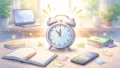 机上の白いデジタルタイマーが主役で、奥に窓光が広がる静かな作業空間のイラスト 時間管理・段取りのなぜ